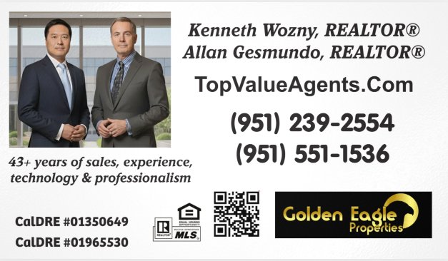 YOU CAN TRUST US TO SELL (OR BUY) YOUR HOME: Prior to becoming a REALTOR®, Kenneth Wozny was a successful Doctor Of Optometry for 25 years with multiple offices in southern California. He has 23+ years of extensive experience so far as a REALTOR®. Collectively, he has worked directly with the public for 45+ years and in these 45+ years he NEVER has received ANY public complaints or any issues with the California Board Of Optometry or the California Department Of Real Estate. Allan Gesmundo, REALTOR® has been licensed in California for over 10 years plus 10 years prior in Pennsylvania.